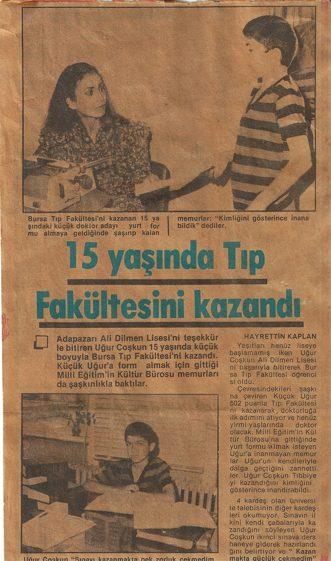 Adapazarı Ali Dilmen Lisesi’ni Teşekkürle bitiren Uğur Çoşkun 15 yaşında küçüçük boyuyla Bursa Tıp Fakültesini kazandı. Küçük Uğur’a form almak için gittiği Milli Eğitim’in Kültür Bürosu memurları da şaşkınlıkla baktılar.